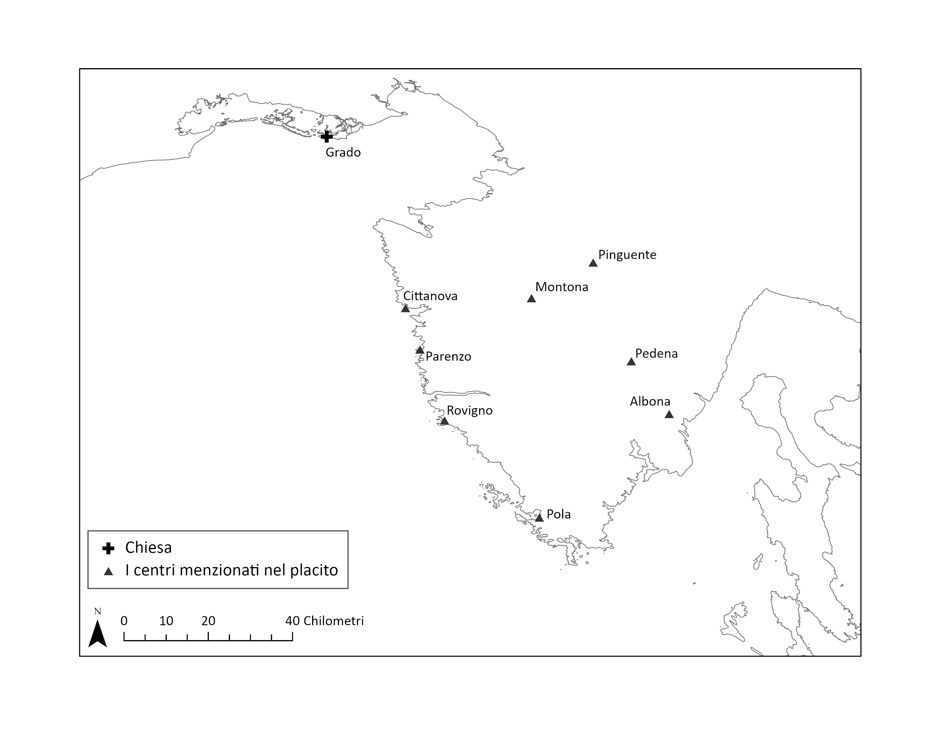 Pochi dubbi vi sono sul significato di civitas: si tratta di un centro urbano che ordina un territorio e che svolge funzioni politico-amministrative, l’unità fondamentale della struttura dell’impero romano fino al VI secolo. Tuttavia, nel placito di Risano, soltanto Pola è definita civitas, mentre per le altre località non vi è alcuna specifica, se non per il numerus tergestinus [67]. Inoltre, sebbene tutti i toponimi siano stati identificati, non disponiamo di notizie esterne che permettano di stabilire la corrispondenza, per il IX secolo, tra una delle località menzionate e un centro cittadino o una struttura difensiva. In effetti, la quasi totalità delle scarsissime attestazioni sono citazioni di vescovi [68], ma questo non è un indicatore sufficiente a dedurre la presenza di una civitas in modo automatico, come vedremo meglio tra poche righe. Più difficile da inquadrare il termine castella, variante di castra, cioè della traslitterazione latina di κάστρα (kastra), parola che ricorre nelle fonti narrative e geografico-amministrative greche tra VI e IX secolo. Sulle possibili accezioni del termine κάστρον/castrum ha lavorato Tiziana Lazzari (2009), all’interno di una riflessione più ampia sull’organizzazione del territorio e la distrettuazione civile nella penisola italica tra VI e X secolo. Secondo Lazzari, κάστρον/castrum non sempre equivale a un punto topografico, magari fortificato, e a capo di un territorio da esso coordinato, ma “può anche indicare un territorio giurisdizionalmente significativo non necessariamente provvisto di un unico centro ordinatore”, un termine, quindi, con contenuto semantico simile a quello di pagus [69]. Se pensiamo in questo modo, non esiste gerarchia né dicotomia tra civitas e castrum: e infatti, il castrum poteva anche essere sede di un vescovo, com’era proprio nel caso di Grado che, fino all’XI secolo, è sempre così definita dalle fonti [70]. Una griglia interpretativa che mi sembra calzare alla perfezione anche alla locuzione “civitates vel castella” e alla lista toponimica del placito di Risano. È soprattutto il contesto generale, la materia trattata dall’assemblea, a suggerire la corretta lettura: ciò che interessava i missi di Carlo Magno non era la lista delle città e dei castelli della provincia, ma dei territori giurisdizionalmente e fiscalmente rilevanti.