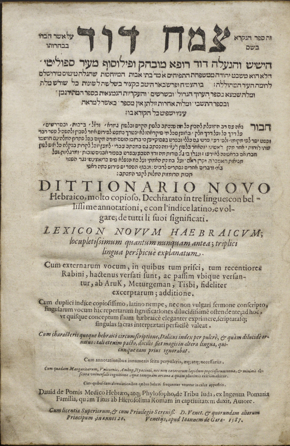 Un decennio più tardi, nel lessico trilingue, ebraico, latino e italiano, intitolato Dittionario Novo Hebraico - צמח דוד (Tzemach David, ovvero “Il Germoglio di Davide”) (Venezia, 1587), David de Pomis (1525-1588), medico ebreo originario di Spoleto, fornisce un’ulteriore testimonianza del significato di Laʿaz e ‘Italqi, entrambi riferiti alla lingua italiana [13]. Nel frontespizio de Pomis descrive il contenuto della sua opera che presenta “i significati de tutte le voci che si trovano nel presente dittionario con li caratteri hebraici che corrispondeno all’Italiano volgare”. Sebbene il termine “Italiano” possa ancora essere interpretato come aggettivo qualificativo di “volgare”, e pertanto alla stregua di una traduzione della locuzione Lashon Laʿaz (lingua Laʿaz ovvero lingua volgare come in de’ Rossi) che appare nella parte ebraica del frontespizio, l’uso della lettera maiuscola sembrerebbe confermare l’ipotesi di Luisa Cuomo (1982, 17-18) secondo cui “Italiano” avrebbe qui funzione di sostantivo e non di aggettivo. Se così fosse, consapevoli della difficolta di determinarlo in modo inequivocabile, de Pomis anticiperebbe di quasi un secolo la prima occorrenza documentata del termine “Italiano” come sostantivo, tradizionalmente attribuita a Marcello Malpighi (1628-1694) in un testo medico della fine del XVII secolo (Malpighi 1697). Vale inoltre la pena osservare che, nell’introduzione in ebraico al proprio dizionario, de Pomis utilizza le espressioni Lashon Italiano e Lashon Latino, invece di Lashon ʾItalqi e Lashon Romi che Azariah de’ Rossi impiegava in conformità con l’uso della letteratura rabbinica, dimostrando così di preferire le denominazioni correnti nell’italiano del suo tempo alla tradizione letteraria ebraica.